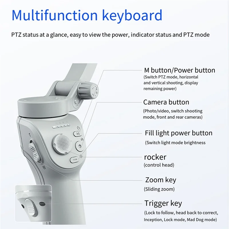 Three-Axis Stabilization, Professional Anti-Shake; Intelligent Tracking, Supporting Face And Optional Target Tracking; Foldable For Storage, Easy To Carry; Front And Rear Cameras Can Be Switched Freely, And Comes With A Beauty Algorithm;