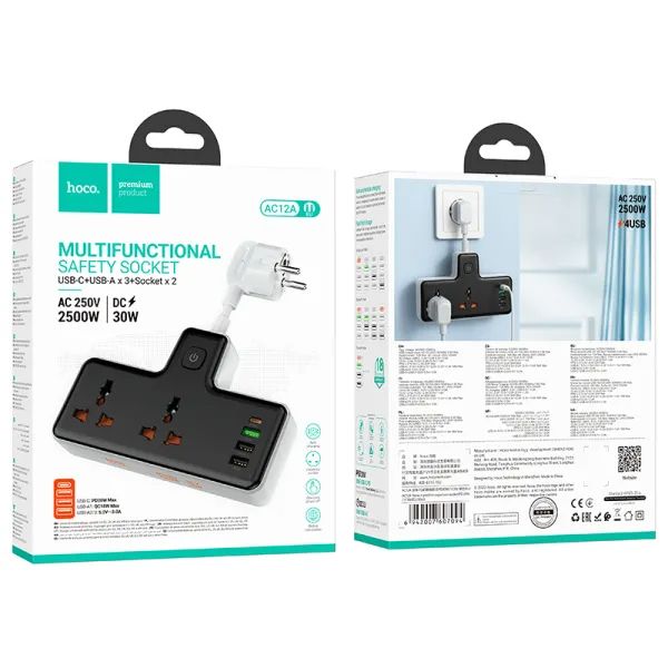 The Hoco AC12A 30W 1C3A Power Strip is a surge protector with a maximum power of 2500 watts. It has 3 AC outlets and 1 USB-A port.